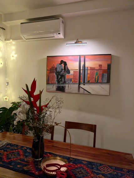Size : 4.4ft x 2.8ftMaterials : Acrylics on CanvasTheme : A couple sitting in their new apartment during sunsetLocation : United States of America